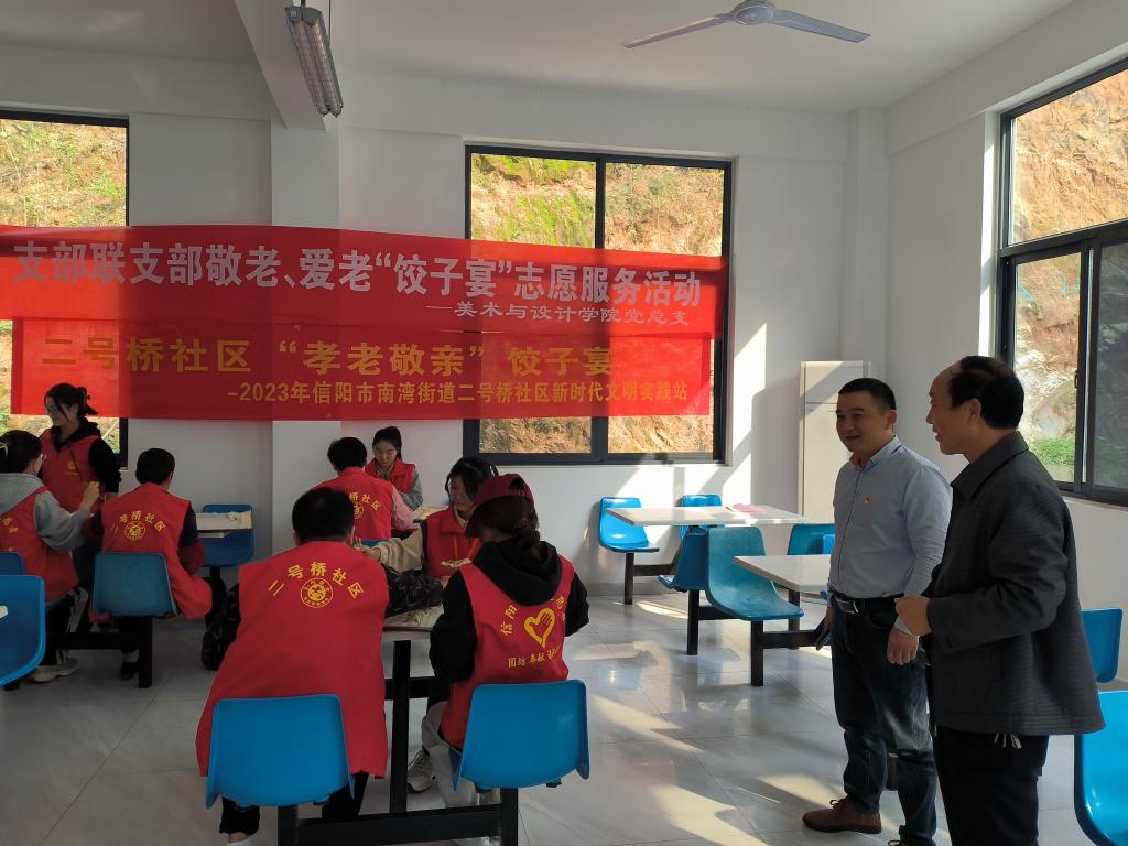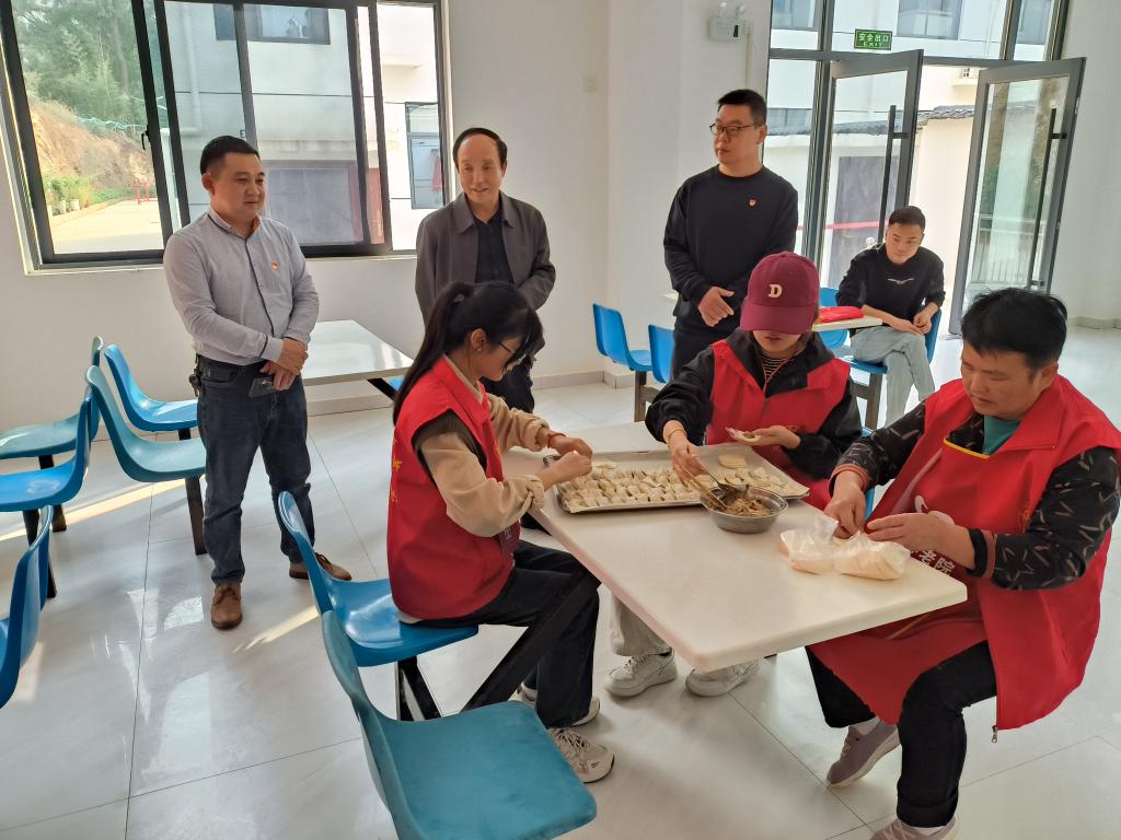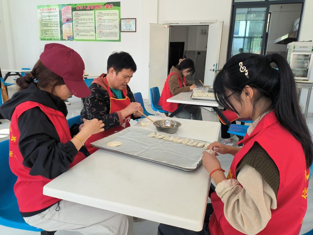 社区党总组织书记赵军,tyc7111cc太阳成集团党总支书记袁军、学生第二支部书记秦金峰与学生党员志愿者在社区工作者的带领下抵达综合养老服务中心。志愿者们与工作人员一同准备活动场地,与工作人员相互协作,拿出准备好的食材,和面、拌馅、擀皮、包饺子、摆盘等等,大家干劲十足,热闹无比。志愿者还将为老人包的饺子码放得满满当当,寓意祝福老人幸福美满。