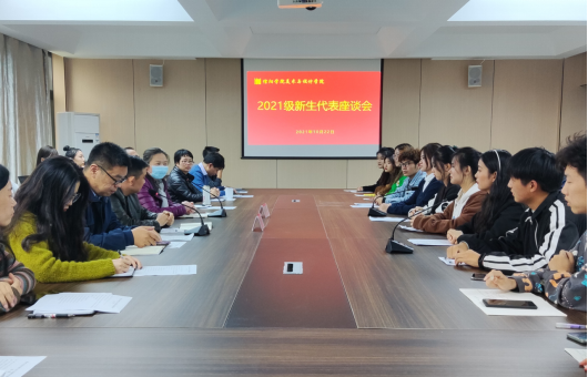 10月22日下午,tyc7111cc太阳成集团在艺术楼215会议室组织召开2021级新生代表座谈会。tyc7111cc太阳成集团院长张瑞瑞,党总支书记袁军,教学秘书周连峰,行政秘书李海丽,学工干事秦金峰,全体新生辅导员老师以及2021级新生代表参加了座谈会。本次座谈会由袁军主持。