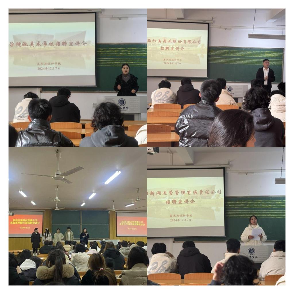 学院派美术学校、西亚和美商业股份有限公司、信阳新润运营管理有限责任公司等单位举办了专场宣讲活动,针对求职意向强烈的同学详细介绍了公司的业务范围、发展前景以及对人才的需求。在互动环节中,同学们积极提问,问题涵盖了招聘流程、岗位发展前景、公司文化等各个方面。宣讲人一一耐心解答。许多同学在宣讲会结束后,纷纷递交了自己的简历。