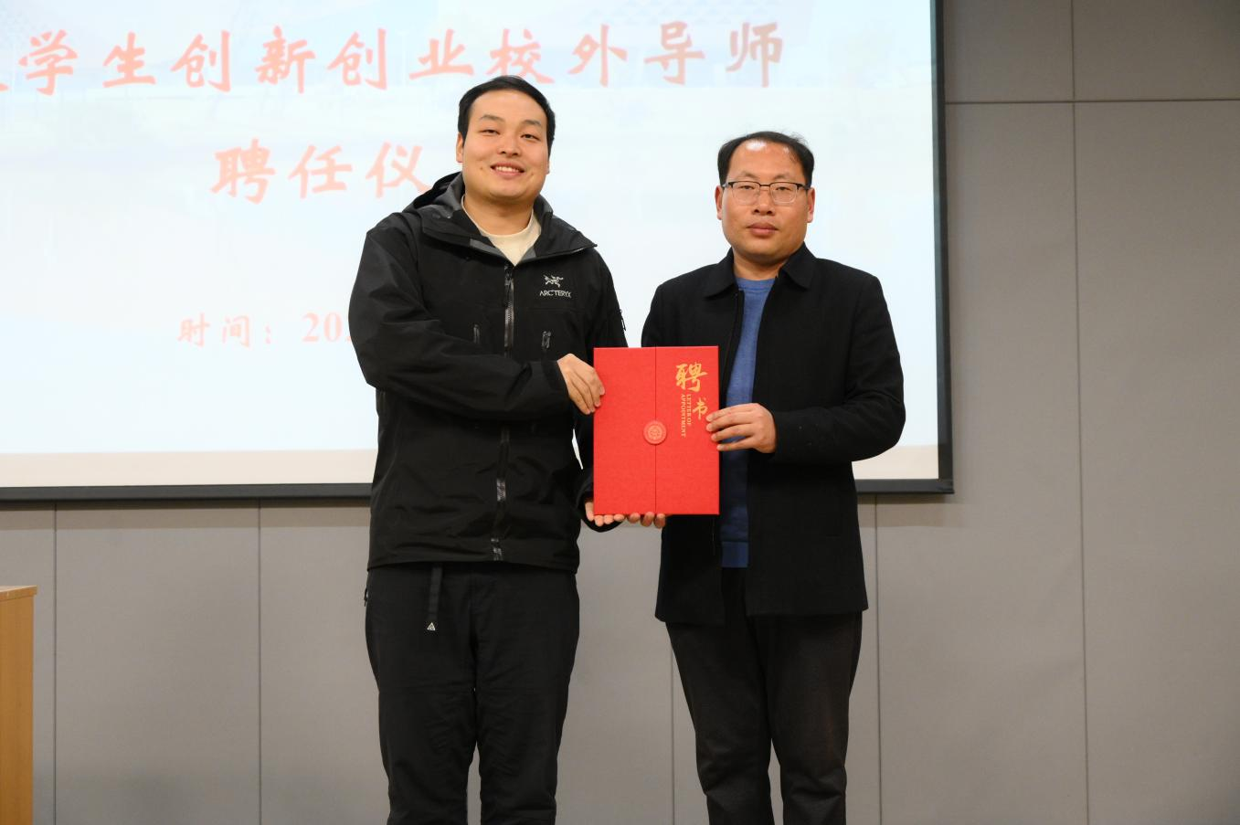 会上,郑山峰代表学院对孔令龙等人来校指导表示热烈欢迎,并邀请其担任tyc7111cc太阳成集团创新创业校外导师,现场为其颁发聘书。