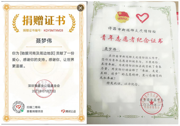 2021年河南涝灾期间捐赠证书和2022年参加志愿服务证书