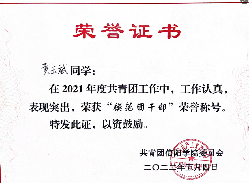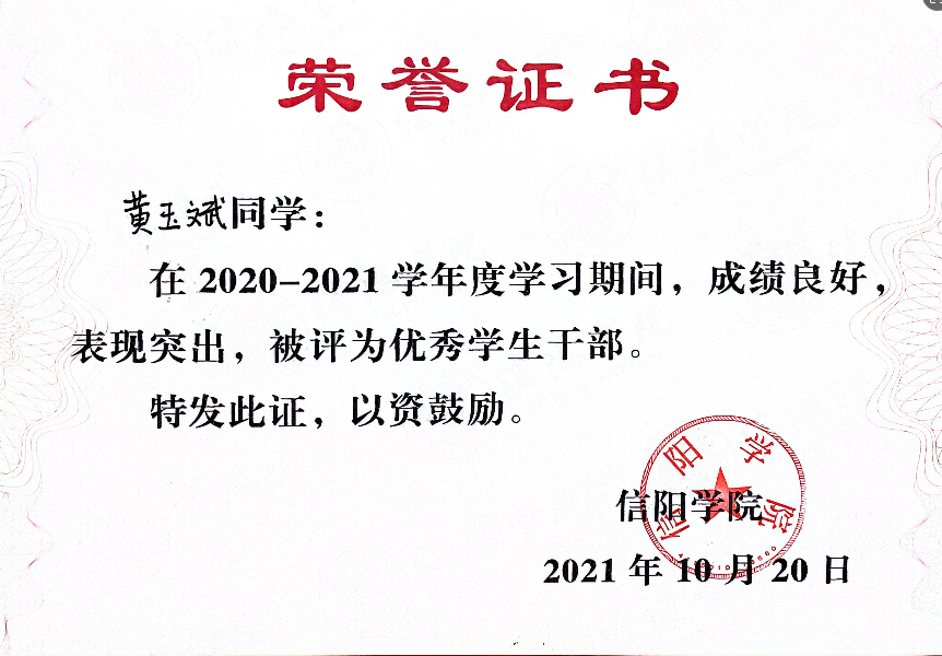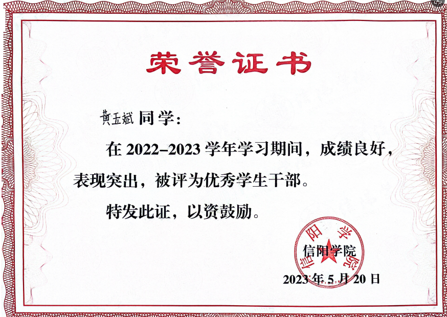 曾获得2020-2021学年太阳成tyc7111cc“优秀学生干部”、“优秀共青团员”。2021-2022学年太阳成tyc7111cc“优秀学生干部”、“模范团干部”。2022-2023学年太阳成tyc7111cc“优秀学生干部”等荣誉称号