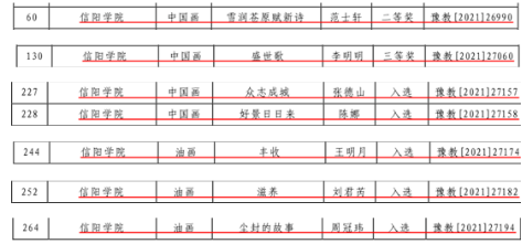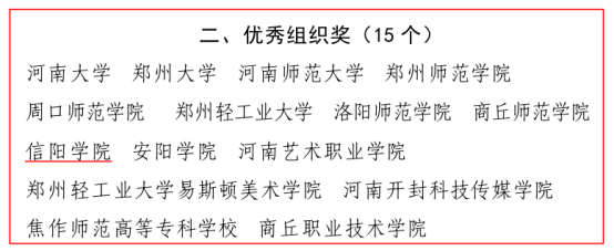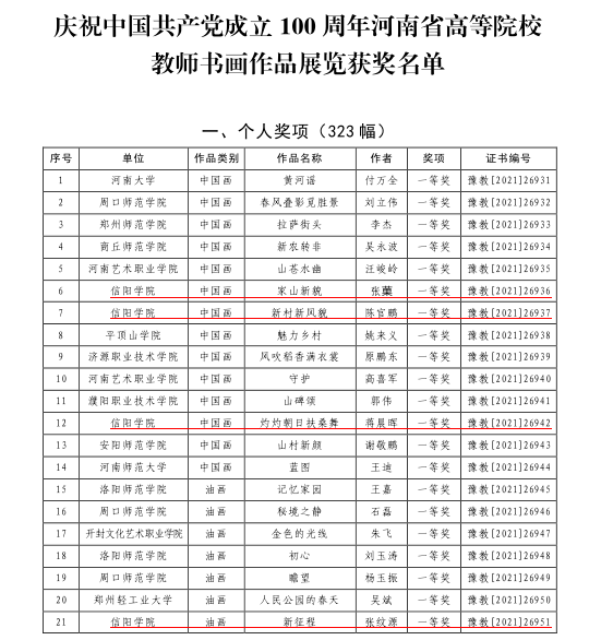 近日,由河南省教育厅、河南省美术家协会、河南省书法家协会联合举办的庆祝中国共产党成立100周年河南省高等院校教师书画作品展览的评奖结果公布。我院共获一等奖4项,二等奖1项,三等奖1项,入选奖5项,学校获得优秀组织奖。