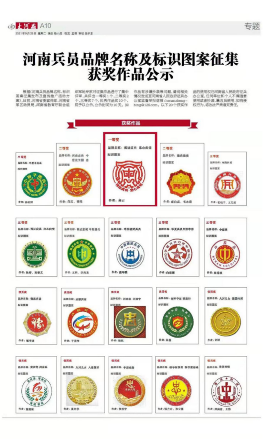 窗体底端 为适应新时代新要求,进一步创立培塑河南兵员品牌,扩大声势影响,助力强军兴军,中共河南省委宣传部、河南省军区动员局、河南省教育厅联合面向社会广泛征集河南兵员品牌名称、标识图案。征集公告发布以来,社会各界大力支持和积极参与,共投稿2000余件,我院教师郑满意、王伟获得此次赛事的优秀奖。