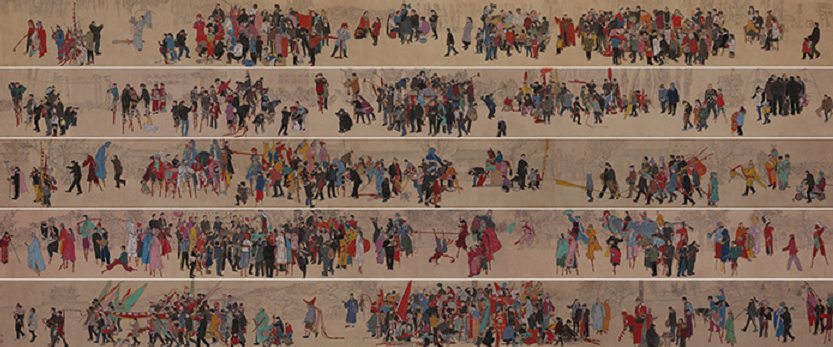 在学校领导的关心和支持下,范士轩老师潜心创作,植根中原文化,创作艺术精品。此次获得资助的作品《古城正月》是其大型民俗乡土题材“正月风”系列作品之一,在多年素材积累的基础上,历经数次修改、打磨、创作而成的工笔重彩人物长卷作品,画中涉及人物共计596人。作品以人物群像的方式对以高跷项目为代表的豫北正月社火活动的过程予以全景式的记录和艺术化的展现,把审美的视角投向民俗活动的参与者,以手中画笔为新时代普通民众造像写真,并以特写式的镜头聚焦年节背景下中原人民的喜庆与祥和。