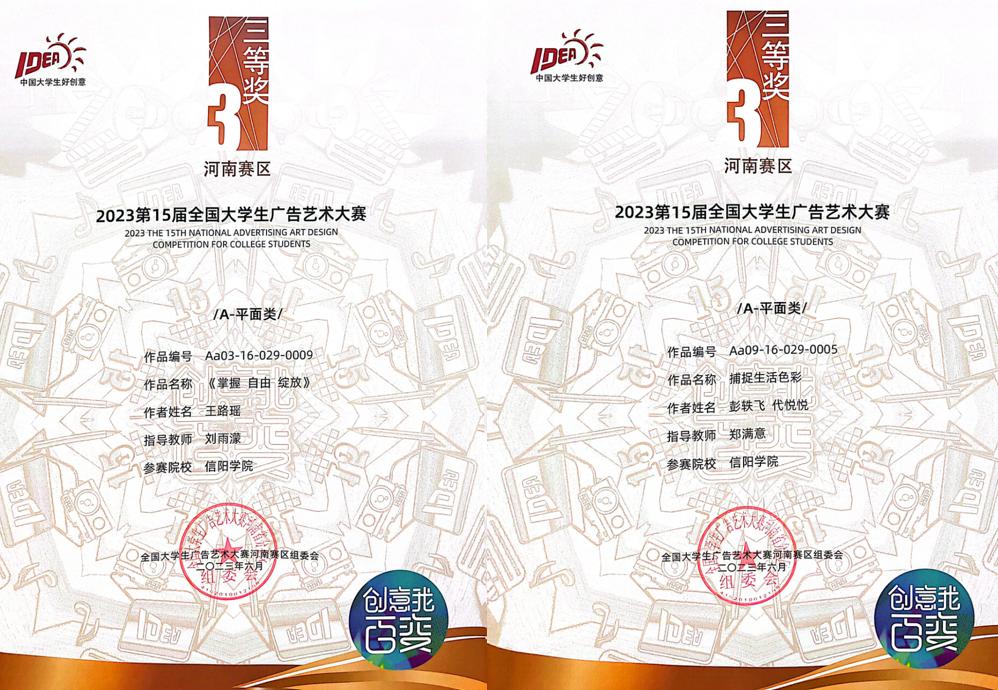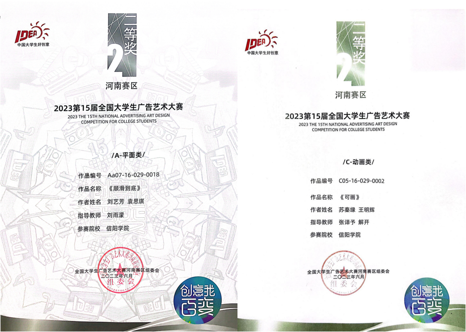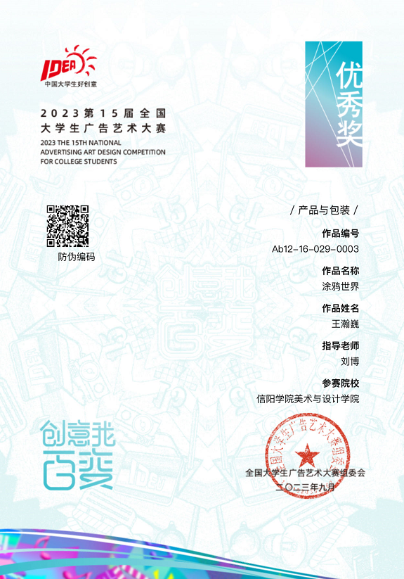 tyc7111cc太阳成集团视觉传达设计、数字媒体艺术专业学生在教师们的指导下参加了此次大赛。学生王瀚巍同学的设计作品《涂鸦世界》荣获国家级优秀奖;在河南赛区中,赵怡薇《雕牌清洁除菌》,刘艺芳、袁思琪《顺滑到底》,李雪晴、闫欣雨《雕牌洗衣店》,王瀚巍《涂鸦世界》,孙戈普、白雨露《哈哈TV》,苏秦缘、王明辉《可画》等设计作品获二等奖;张万权《万物皆可画》,陈栋梁、刘翔《无“即”而生妙不可言》,张茜《做设计竟可以这么快!》,王路瑶《掌握自由绽放》,朱骊安、张聪《沃派更快更广》,张灿婕《XPPEN》,赵瑞雪、胡思琪《追逐梦想绘真我》,彭轶飞、代悦悦《捕捉生活色彩》,施姿瑶《IP形象设计-泡泡玛特》,李美佳《可画,时刻设计》等设计作品获三等奖。我院刘博、刘雨濛、郑满意、解开、张译予获优秀指导教师。