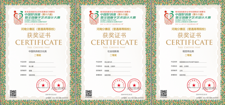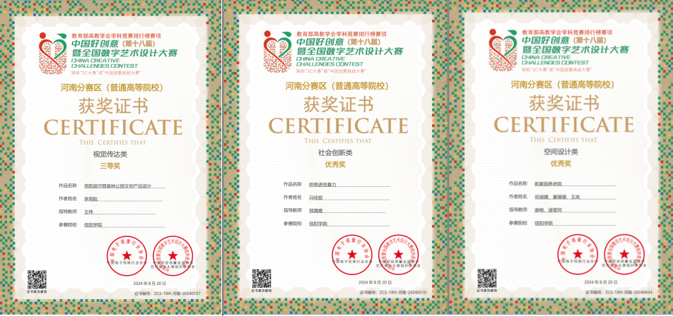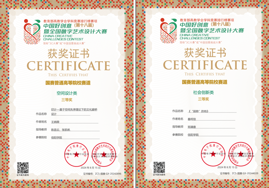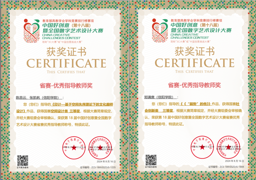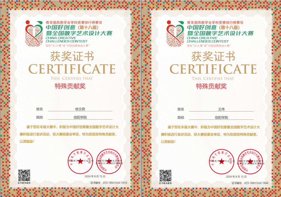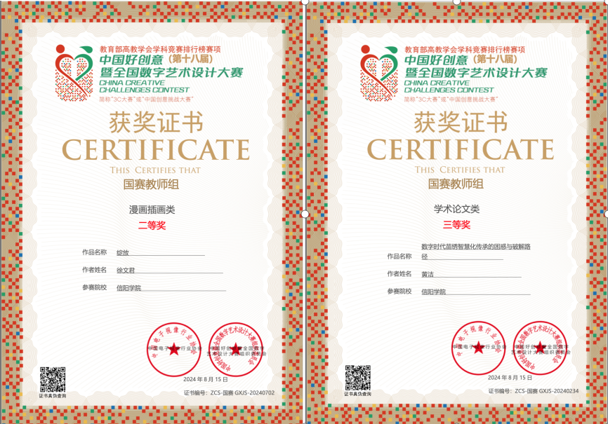 我院在第18届中国好创意暨全国数字艺术设计大赛中获佳绩:共获得省级赛奖项6项、全国赛等级奖4项。国赛教师组:徐文君获得国赛二等奖,黄洁获得国赛三等奖。国赛学生组:王炳舜和秦柯佳分别获得了国赛三等奖。