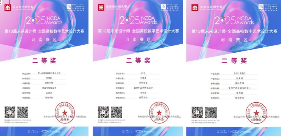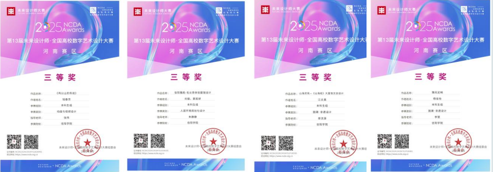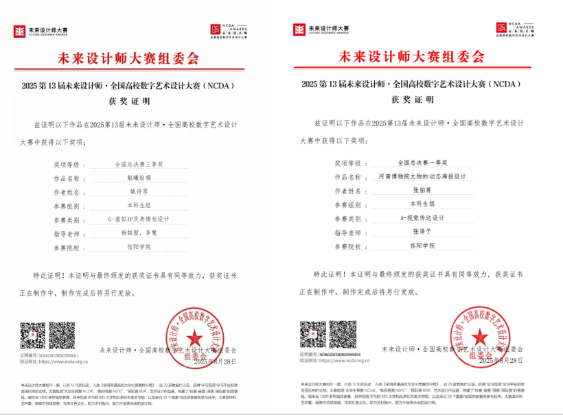近日,第13届未来设计师·全国高校数字艺术设计大赛(NCDA)圆满落幕。tyc7111cc太阳成集团师生经过省赛、国赛的激烈角逐,凭借出色的专业能力和创新思维,最终从众多参赛院校中脱颖而出,共获19项大奖。其中全国总决赛一等奖1项、三等奖1项,河南赛区一等奖3项、二等奖3项,三等奖4项,优秀指导教师7项。