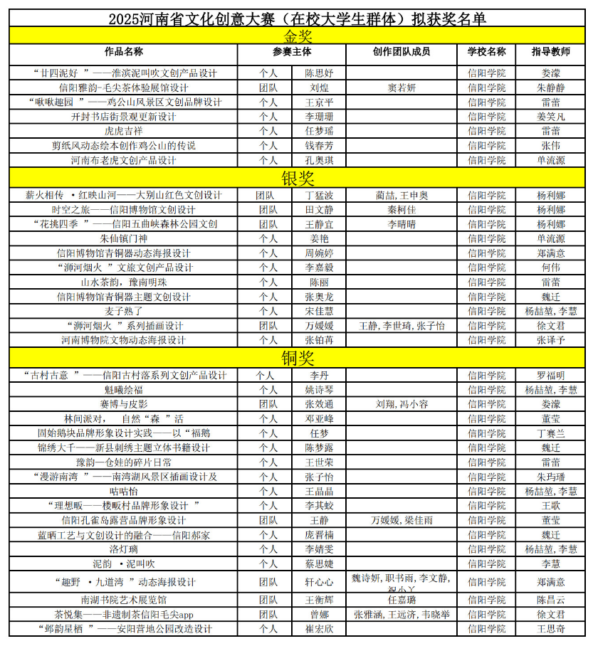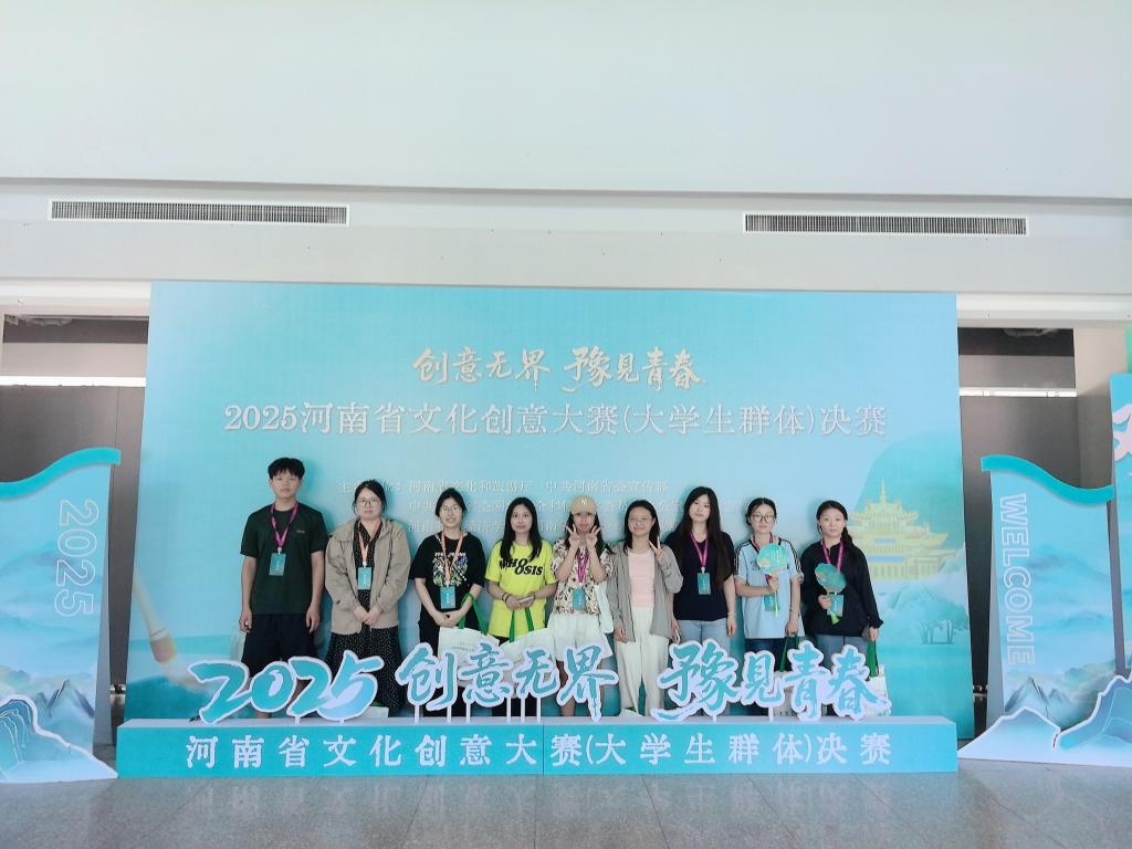 近日,2025年河南省文化创意大赛(在校大学生群体)圆满落幕。经过作品征集、初评、终评等多轮严格评审,我院学子凭借扎实的专业功底与出彩的创意,在众多参赛作品中脱颖而出,成功荣获金奖7项,银奖11项,铜奖18项。暑假期间,我院朱静静、单流源两位老师带领入围省级决赛的选手参加了比赛。