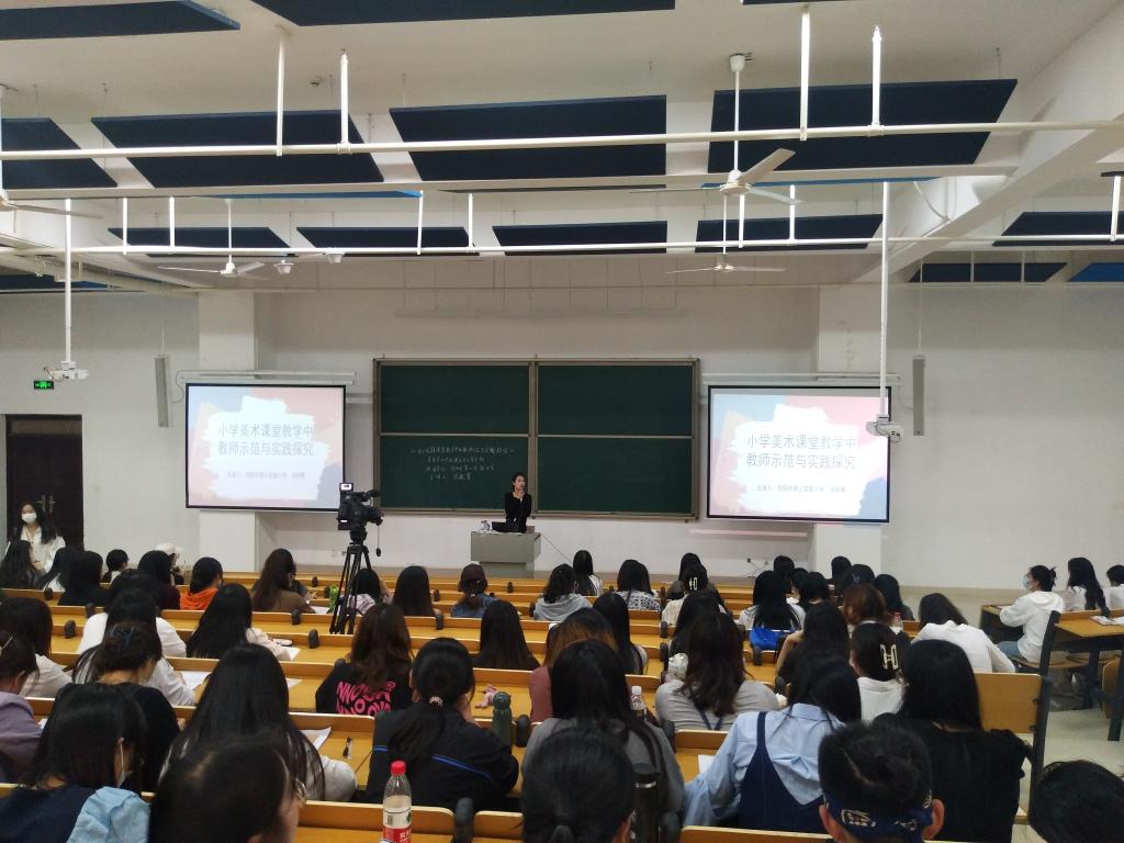 为深入开展美术学专业2019级学生教育见习工作。5月20日全天,学院组织美术学专业2019级全体学生在综合楼202教室开展集体学习观摩活动。学院邀请教育见习实践合作单位信阳市第三实验小学周小兰、宋林霄两位优秀教师,作为学院校外教育见习指导老师,在保障疫情防控期间人数限制的前提下,两位老师分别以中小学班主任工作、中小学美术专业课为内容,分批次、分场次、分专业方向共开展了四场讲座报告。周扬主持了讲座报告。