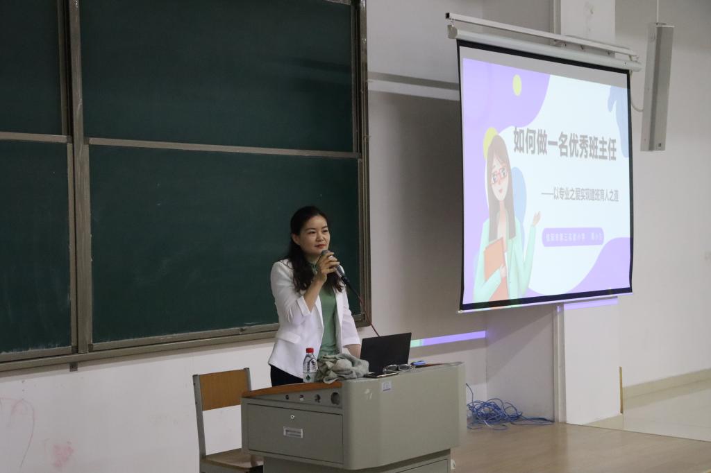 周小兰老师做了题为《如何做一名优秀班主任—以专业之爱实现建班育人之道》讲座报告。先以不久前刚结束的教师资格证面试经验分享为引,然后围绕工作案例从八个方面、“四心”,以及班主任工作18个细节,来分析中小学班主任中涉及到的建班、管理、人际、心理、家校、沟通、时机等内容,时不时和学生们提问互动,现场学习交流的气氛浓郁。
