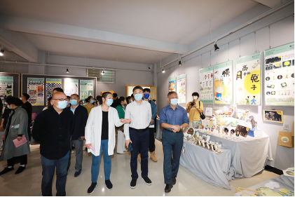开幕式结束后,王志华、王强仔细参观了展览作品。王校长一行在观展时兴致满满,对展览作品质量给予了高度肯定,对作品融入地方文化的成果表现给予了赞扬,并在教学成果融合校园服务、加强校园美育、加大展览的校内外宣传等方面提出了中肯意见。