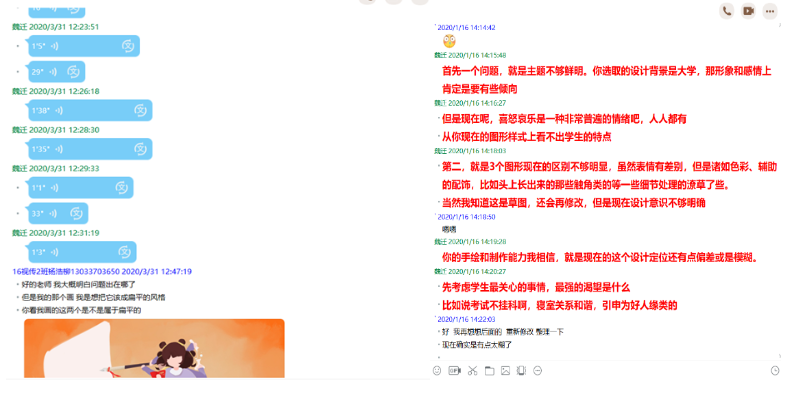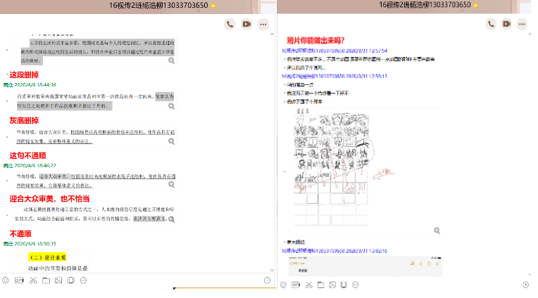 法国艺术家杜尚曾说:“每个人一生最好的作品,应该是我们所度过的时光”。对于艺术生而言,毕业创作是对自己大学四年生活时光的最好见证。为了能够一如既往地帮助学生完成毕业创作,指导老师邱京京采用线上互动的方式,“遥控”指导学生完成毕业创作。为帮助学生克服创作瓶颈,又通过网络传送给学生大量的创作资料、参考书籍,让学生在家也能够享受到与在校时一样的学习资源。为了在线指导不误时,邱京京老师和学生约定好查看作业、回复信息的时间,保证可以及时和学生沟通创作进度,保证指导质量。