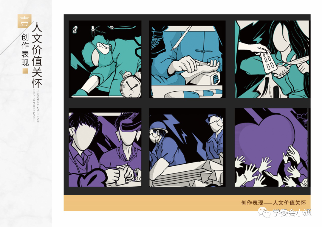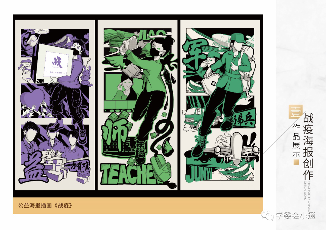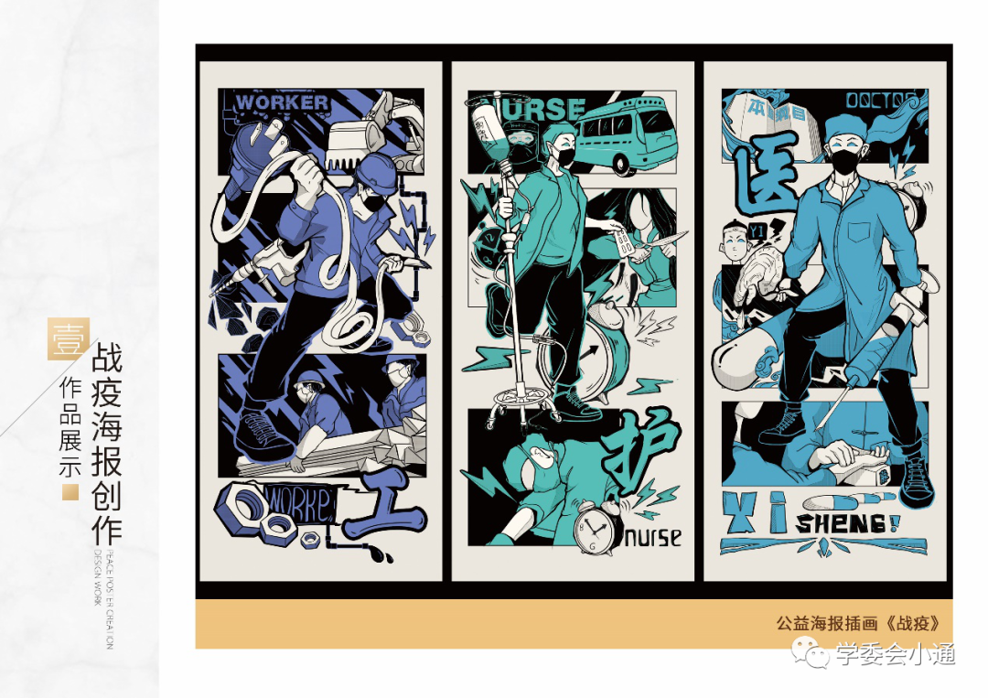 设计说明:以插画创作人物形象创作为切入点,结合抗疫期间社会百态现象提炼人物形象特征和相关要素进行夸张化、艺术性处理手法,应用到海报设计中使人物造型特征鲜明同时迎合大众审美。背景采用漫画分镜的创意表达丰富画面和构建故事情节应用到海报设计中达到与受众的情感交流达到意向传达的目的。
