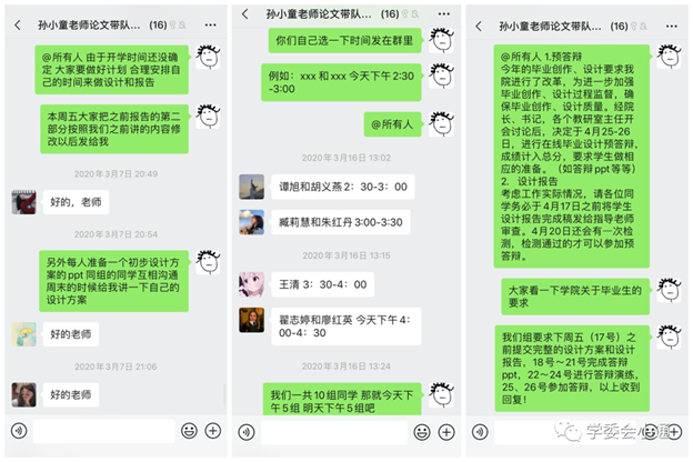 由于疫情,本学期推迟了开学时间,虽未到校,2020届毕业生设计的指导工作却丝毫没有受到影响。根据校教务处的通知,此次利用网络手段与学生远程互动,保证同学们的毕业设计和报告可以有序进行。首先,每周集体召开一次腾讯会议,14位同学逐一汇报本周进度,同时互相交流,取长补短。其次,每组同学每周至少一次的预约时间,提出自己在设计和报告写作中遇到的具体问题,指导老师依据各组的实际情况给出意见和要求。除此之外,一方面创建全体微信聊天群,可以随时随地更新学校及学院发布的任务,通知大家开会时间等;另一方面分别与学生的设计小组建立微信群,共享与每组同学设计主题相关的学术资料。即使没有面对面交流,依然能够确保每位同学按时保质的完成自己的毕业设计和报告。目前预答辩和最终答辩都已开展完毕,答辩效果良好。