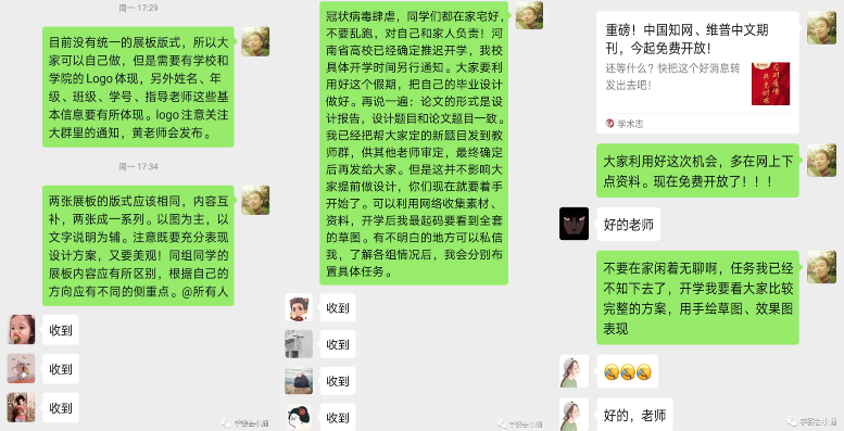 今年的应届毕业生由于受到了新冠肺炎疫情的影响,过了一个特殊的寒假,虽然不能在学校,但是在家也是一直马不停蹄地忙于毕业论文和毕业设计,作为毕业指导老师,当然在心里是比同学们更加着急,每时每刻都牵挂着同学们的毕业论文和毕业设计,虽然带了十几位同学的论文和设计,再加上还有三门的非毕业生的课程,但是老师还会在空闲时间把精力都用在同学们身上,给每位同学一定的指导意见,从论文的内容到形式、从毕业设计的草图到终稿,老师都是经常通过集体开腾讯会议进行指导,当然更多的是针对每位同学的情况随时随地用微信等方式给与同学们单独指导,无论是早上八点前还是中午十二点,甚或是晚上十一二点,经常是错过吃饭时间,家人经常会说怎么会这么忙!我也只是点点头让他们先吃,随后不管饭菜热凉随便吃上几口。只要学生需要老师指导的地方老师都会认真与同学们沟通,经常会出现电脑崩溃死机,手机内存爆满、没电等情况,但是这些我也没有任何抱怨,只是想让同学们在离校前做好最后一次作业,给自己的大学生活交上一份完美的答卷,顺利毕业就是老师最大的心愿!