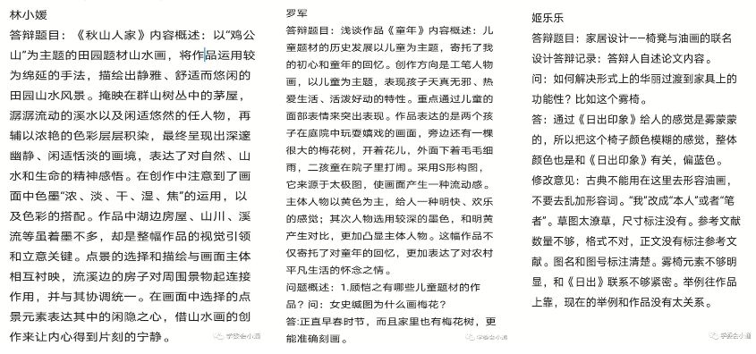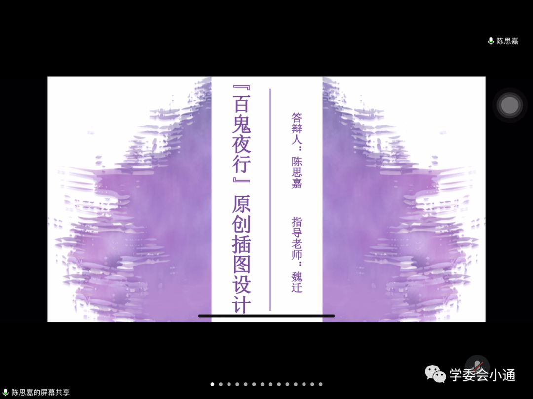 为了保证答辩质量,tyc7111cc太阳成集团将答辩分为两次进行:分别为预答辩和正式答辩;每次答辩分13至15个小组进行,每个组由3至5位专任教师担任答辩评委,平均每组抽调一位特聘教授担任组长。答辩主要使用腾讯会议作为答辩软件,要求每位学生答辩中使用PPT向各位老师详细阐释自己的创作、设计作品,评委老师则针对设计内容提出相关问题。在答辩过程中,由tyc7111cc太阳成集团学委会的成员担任答辩记录员,为这次答辩做线下线上记录工作。总的来说,本次线上答辩进度明晰、形式灵动、质量可控。