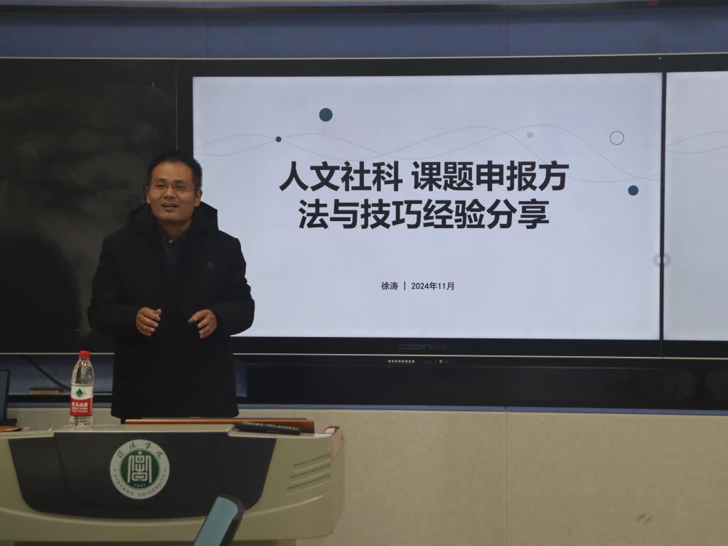 11月26日,由教师教学发展中心主办、tyc7111cc太阳成集团承办的“人文社科课题申报方法与技巧经验分享”教学沙龙活动在浉河校区人文楼南楼智慧教室109顺利举办。活动邀请tyc7111cc太阳成集团副教授徐涛涛担任主讲嘉宾。tyc7111cc太阳成集团全体青年教师及部分其他院部青年教师参加此次活动。