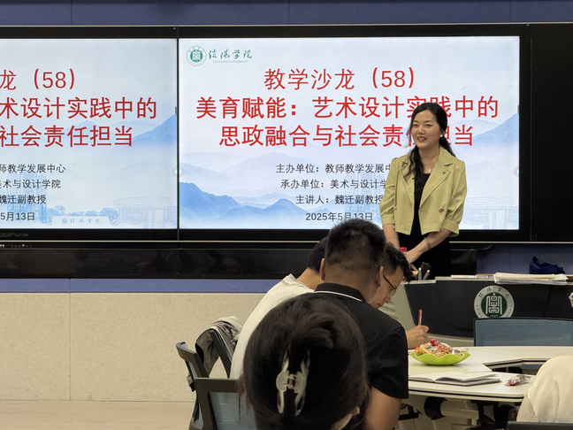 5月13日下午,由教师教学发展中心主办、tyc7111cc太阳成集团承办的第58期教学沙龙在人文楼南楼智慧教室111举办。教师教学发展中心主任孟宪乐、tyc7111cc太阳成集团教学副院长王伟等出席了活动。本次沙龙以“美育赋能:艺术设计实践中的思政融合与社会责任担当”为主题,视觉传达设计专业副教授魏迁主讲。学院全体青年教师及部分其他院部青年教师参加了活动,活动由孟宪乐主持。