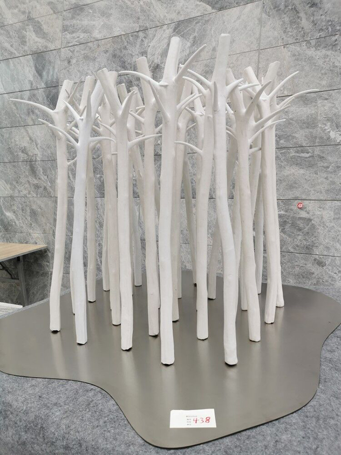 朱晓磊的陶瓷作品《共生·融》以当代观念陶瓷雕塑的形式,将当下社会中的每个生命个体比喻为树木,呈现出融汇交错、相互依托的生长姿态,体现作者在时代背景下对万物相融共生的生态关系的思考。