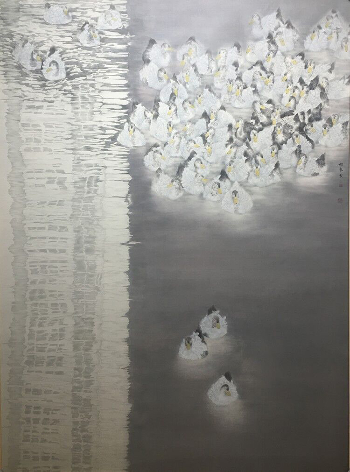 向旭东国画作品《都市涟漪》运用中国工笔画中勾勒、晕染技法,以点线面构成形式,描绘了暖春时节,群鸭夕归划过城市倒映水面祥和安宁的景象,意在呈现当下中国都市生态文明和谐景象。