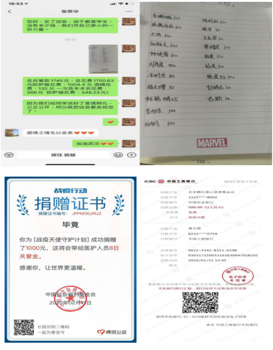新冠肺炎疫情发生以来,我院学子时刻牵挂战“疫”形势,踊跃捐款捐物、奉献爱心,用实际行动支援抗疫一线。疫情爆发之初,湖北省医疗物资极度缺乏,2018级美术学本科2班冯国威了解到后心急如焚,虽然身在家乡,但一直想着要为湖北抗疫前线做些事情。他立刻联系了同学们,经过商议通过多方渠道为武汉募集防毒面罩5套、滤棉二十只、眼罩5只、一次性手套150双,将捐医疗物资以最快的速度顺利送达医护人员手中。张付茹,2017级美术学本科1班学生,自疫情蔓延以来,张付茹同学被医护人员的众志成城抗击新型冠肺炎疫情而感动,疫情期间其组织身边同学朋友筹集善款1745元,用来购买防护服、酒精、一次性手术衣等医疗物资捐往武汉。郭明昊, 2017级美术学本科3班学生,看到众多医护人员、志愿者们奋战在第一线,也想尽绵薄之力,便通过腾讯公益向中国社会福利基金会捐款1000元。康文琳,2019级视觉传达专升本1班的学生,经常关注着微博,被大家的众志成城抗击新型冠状病毒疫情而感动,康文琳拿出自己的压岁钱向北京韩红爱心慈善基金会捐助500元。血浓于水,齐心战“疫”。参与此次活动的同学们纷纷表示,在活动过程中不仅献了爱心,传递正能量,更是彰显患难于共、守望相助的同胞情谊。