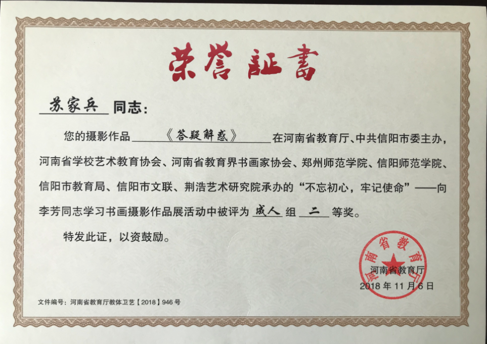 日前从河南省教育厅公布的“不忘初心 牢记使命”向李芳同志学习书画摄影作品展与歌咏活动评奖结果得知,我院教师苏家兵的摄影作品《答疑解惑》获得二等奖。据悉,该比赛从7月份开始征集作品,历时一个多月。组委会共收到参赛作品2000余件。参与师生多,涉及范围广,活动影响大。最终,共评出书画摄影获奖作品389件,其中摄影类获奖作品48件,学生组7件,成人组41件。我院教师苏家兵获得成人组里18个二等奖其中之一。