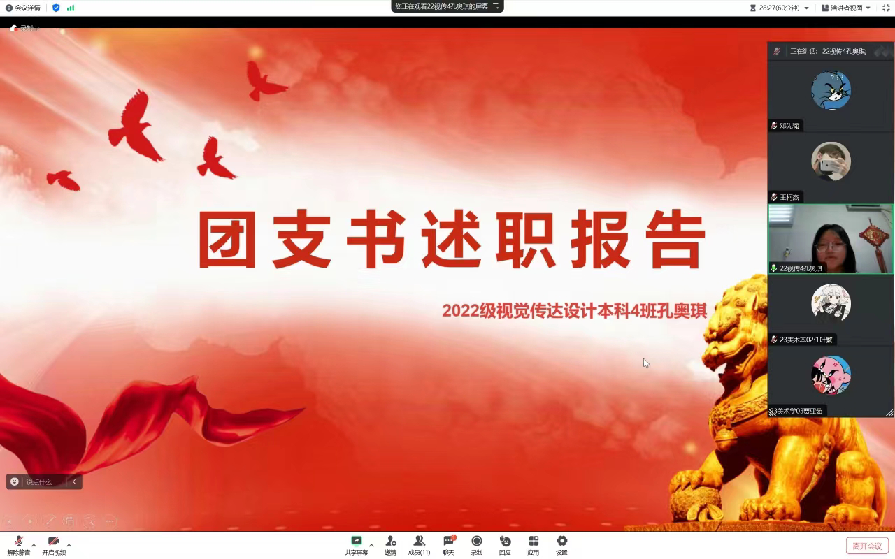 会上,各年级团支书依次进行述职,汇报自己在任期内的工作情况,包括团组织建设、活动组织、团员管理等方面的工作成果、经验和不足之处。结合团支部工作实际,详细汇报了本学期的工作职责落实情况和成效成果,充分展示各支部成员积极向上、团结和谐的精神面貌。