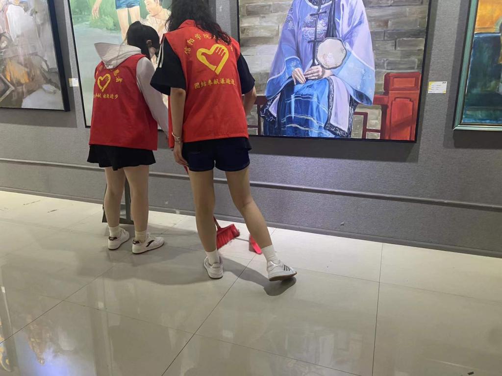 毕业设计展览作为美设学院的一项重要学术活动,每年吸引大量的校内外嘉宾、在校学生以及艺术爱好者前来参观。志愿者们在不影响观众参观的前提下,分时段对展厅进行细致地清扫。他们清洁展品玻璃,整理接待区,扫除地面灰尘,并及时处理垃圾。此外,志愿者们还负责引导观众,确保展览秩序井然。他们的辛勤工作使得展厅焕然一新,干净舒适的观展环境让他们能更专注于作品本身,更好地感受艺术设计的魅力,为观众留下了良好的观展印象,同时,这也体现了我院对于艺术教育的投入和对每一位学生劳动成果的尊重。