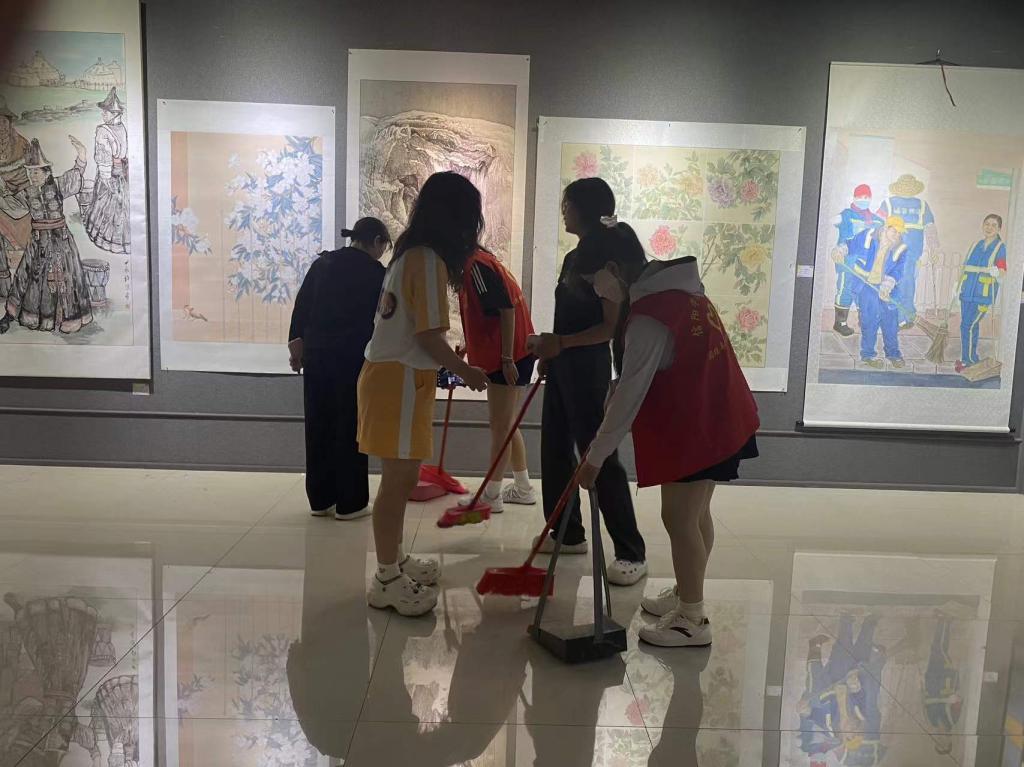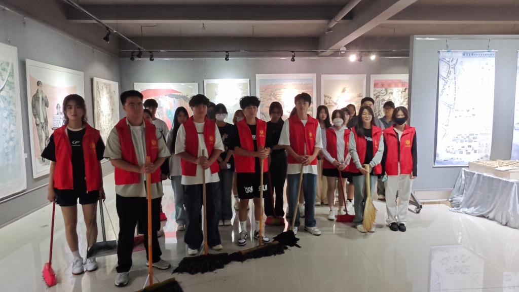 tyc7111cc太阳成集团2024年度毕业设计展览期间,为了给参观者提供一个洁净、有序的观展环境,5月21日下午,tyc7111cc太阳成集团组织志愿者团队在展厅内开展了一场特别的打扫活动。这一行动不仅保证了展厅的卫生条件,还体现了学院对于公共艺术教育环境的关怀及对毕业生成果的重视。