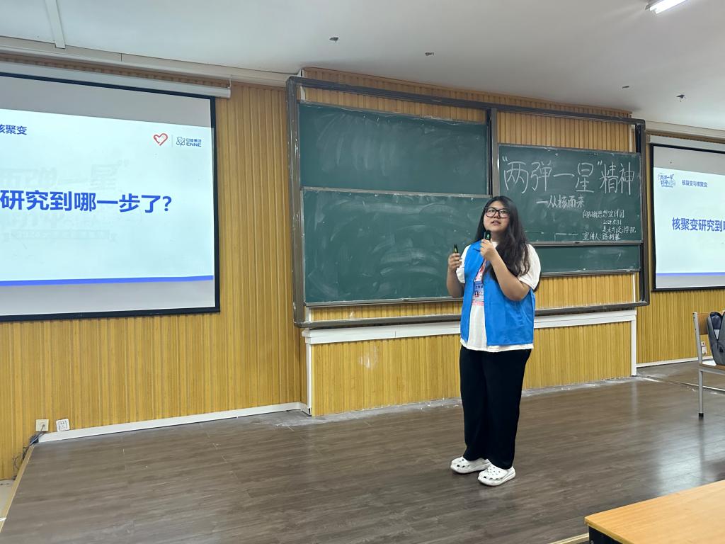 在活动中,宣讲人向大家介绍关于“华龙一号”的诞生和现状,依次介绍了华龙一号的研发历程、创新成果、示范工程,以激发大家探索未知,敢于创新的热情,让大家学习不屈不挠的奋斗精神和淡泊名利的无私奉献。“两弹一星”精神的宣讲,让同学们深刻意识到“两弹一星”精神是在艰难困厄之中产生的,是中华民族的宝贵精神财富。