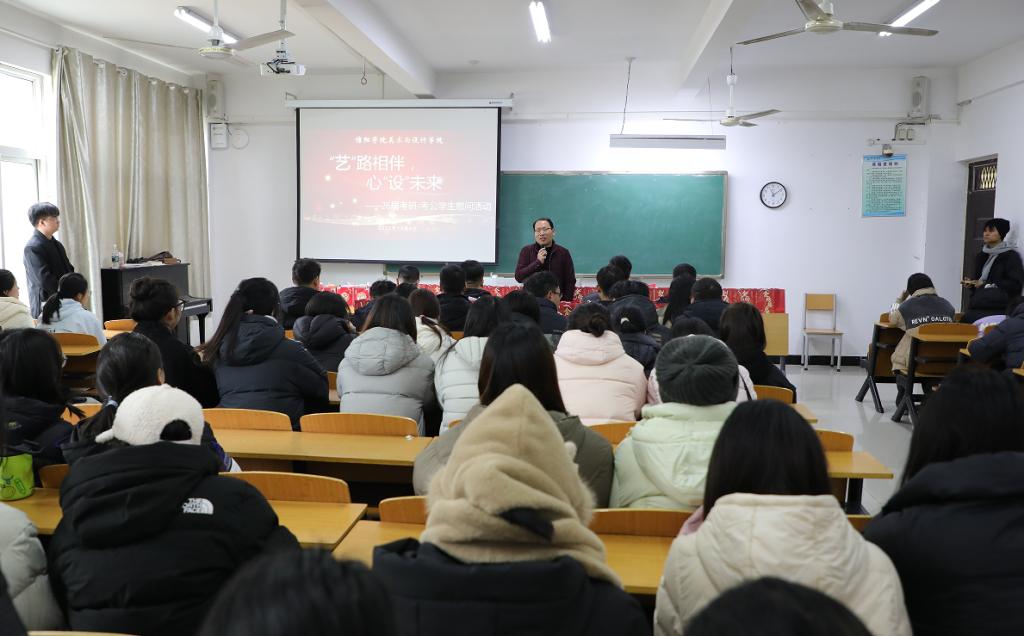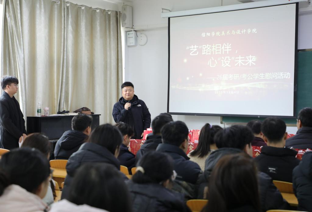 为助力毕业生考研、考公备考,缓解备考压力,12月4日上午,tyc7111cc太阳成集团“‘艺’路相伴,心‘设’未来”2026 届毕业生考研、考公指导慰问活动在艺术楼206教室顺利举行。学院党总支书记郑山峰、教学副院长王伟、教研室主任、毕业班辅导员及 2026 届考研、考公毕业生共同参加了活动。