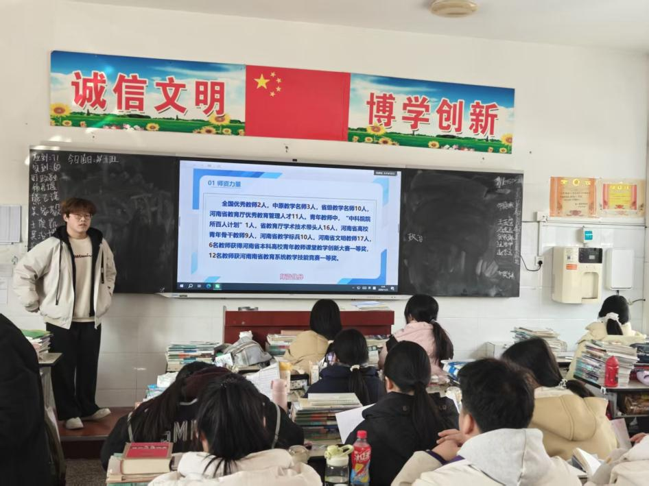 追光调研队杨浩哲、蔡凯地、张朝溢三位同学重返栾川县实验高中,以“追光而行,赋能成长”为主题开展社会实践。团队结合专业所学与大学生活感悟,为高三学子分享备考经验、志愿填报要点及大学专业发展前景,通过面对面交流精准解答大家在学习与规划中的困惑。队员们以踏实认真的态度、积极向上的风貌,将所见所闻、所学所获倾囊相授,用实际行动诠释追光者的责任与担当。