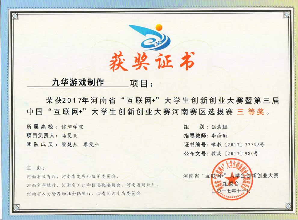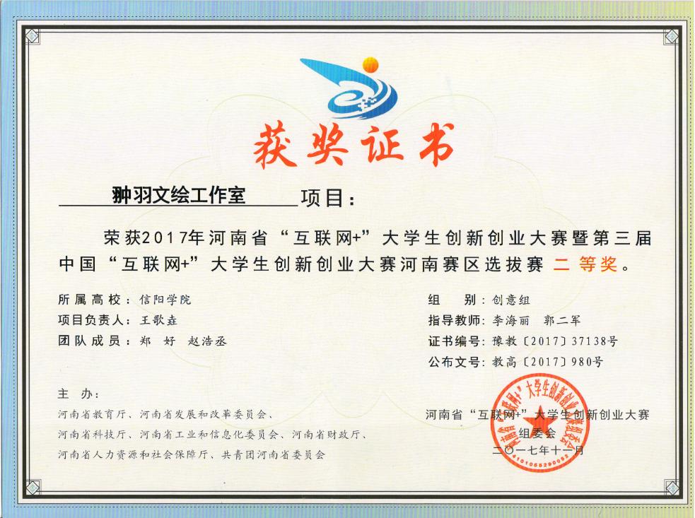 日前,从河南省教育厅传来喜讯,第三届河南省“互联网+”大学生创新创业大赛总决赛获奖项目人员名单公布,我校参赛项目获二等奖3项,三等奖7项,并获得优秀组织奖。其中,我艺术学院选报的王歌垚团队的创业项目“翀羽文绘工作室”获得二等奖,马昊玥团队的创业项目“九华游戏制作”获三等奖。