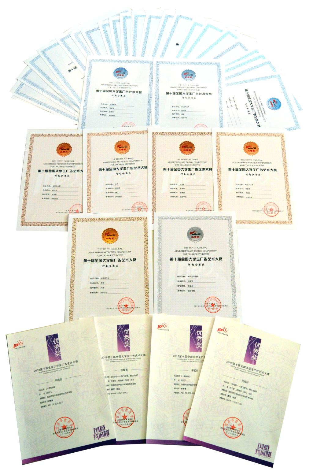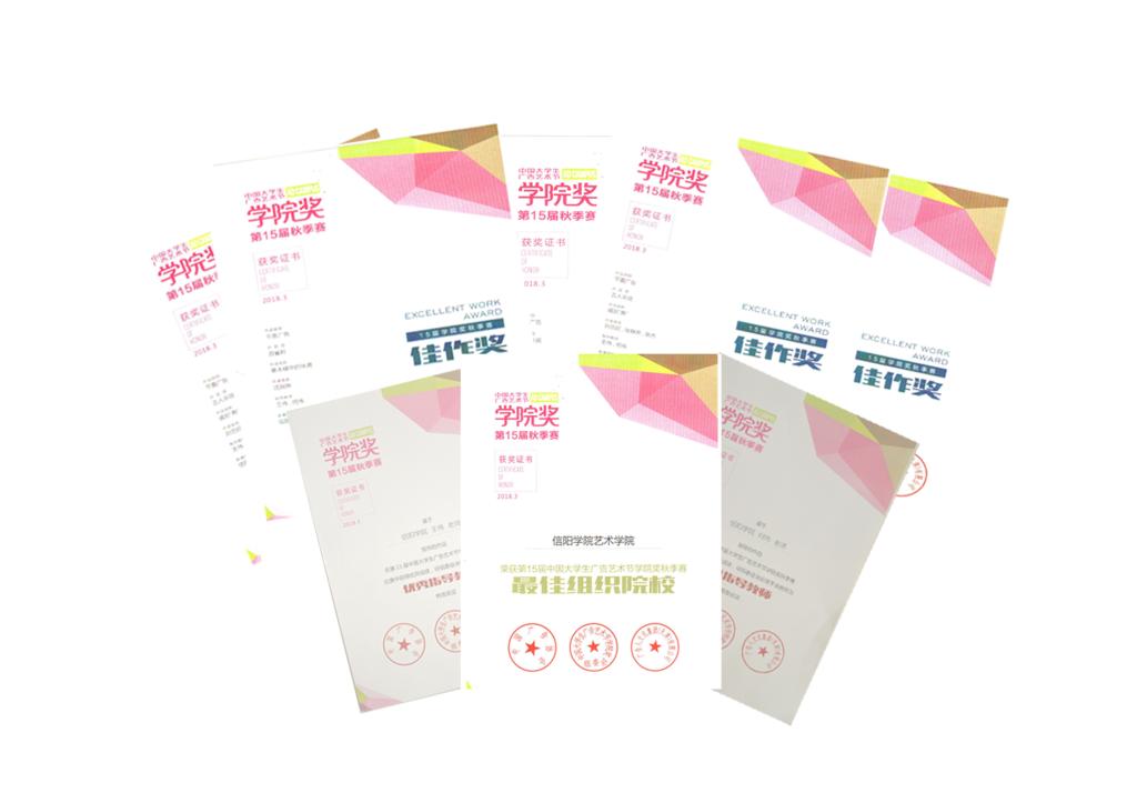 在第十届全国大学生广告艺术节大赛中,我校视觉传达设计专业学生林士姣、许恬飞获得全国总决赛优秀奖两项,张静芳荣获河南赛区二等奖,李扬扬、樊泽阳、刘春焕等同学荣获河南赛区三等奖四项,游铠豪、白金风等同学共荣获河南赛区优秀奖26项。董莹、苏家兵、王伟、何伟、魏迁、郝倩倩等五位老师荣获优秀指导奖。