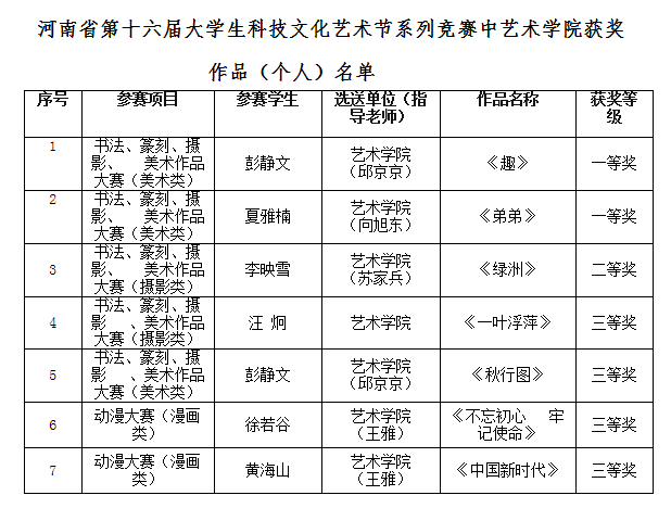 日前,河南省第十六届大学生科技文化艺术节系列竞赛活动获奖作品发布,我院学生荣获一等奖2项,二等奖1项,三等奖4项。