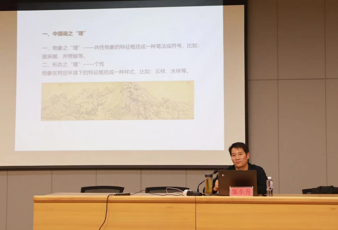 邹东升教授首先从当下流行的审美倾向、其他艺术门类的借鉴、工匠精神的注入和“形式感”的追求等几个方面梳理了当代工笔人物画的创作主流,然后结合名家作品详细阐述了人物画创作需要注意的几大要素,如创作的立意与立异,画面的“合理性”,物象与形态的“迁想妙得”,平面上的“置陈布势”等,为学生提供了较为清晰的创作思路。同时邹教授还就当代工笔画的一些现状提出了自己的思考。最后,邹教授结合自己近年的创作,从立意、素材的收集、画面处理、主题表达、意境追求上完整呈现了创作的全过程,不仅展现了这些优秀作品诞生的背后故事,同时也为同学们的绘画创作提供了一些借鉴。在两个小时的讲座中,邹教授生动的讲解,精湛的造诣,对绘画创作的经验见解和勤奋严谨的创作态度,都深深感染和激励着与会师生。