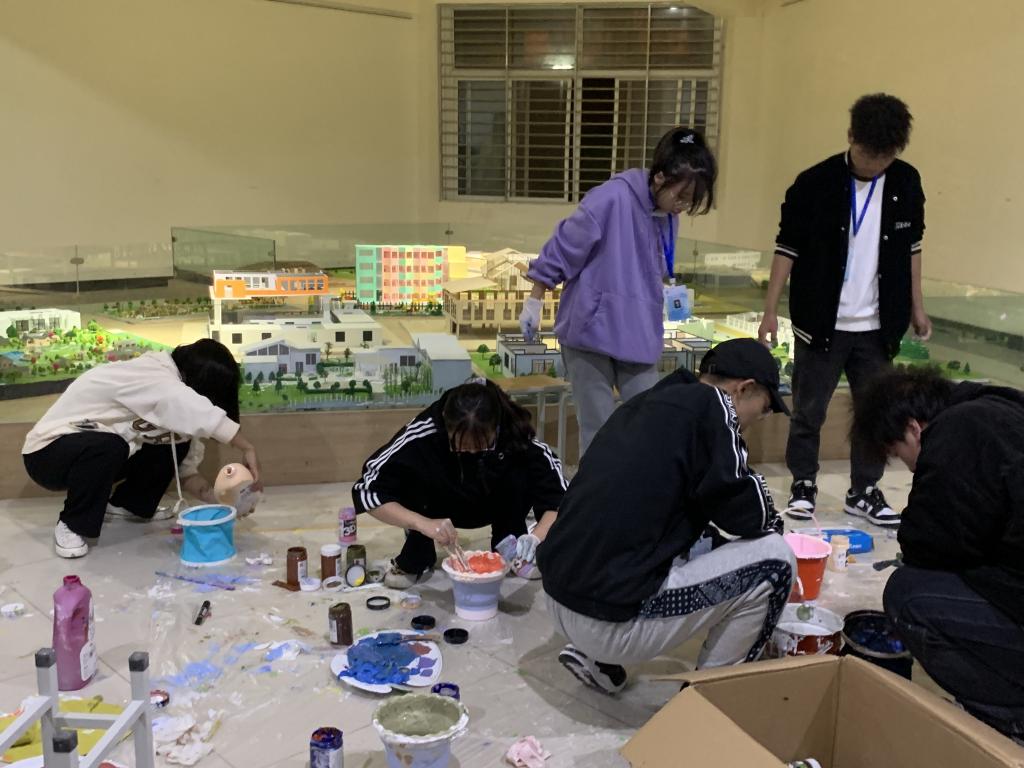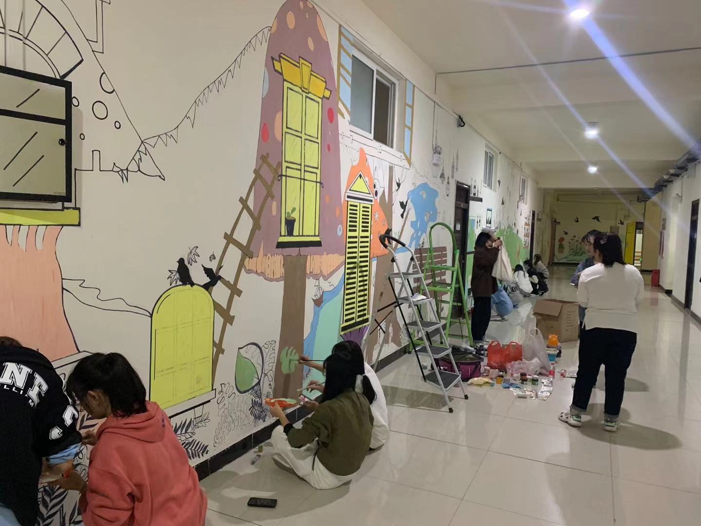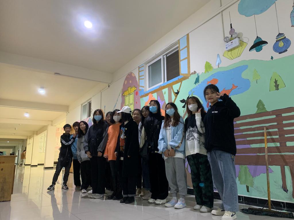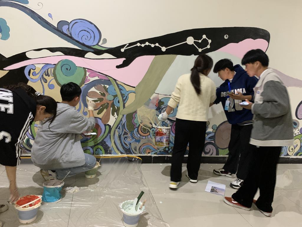 本次绘制的墙体面积大、内容丰富多变、色彩要求复杂,为保障墙绘绘制的效率和质量,在该墙绘活动的指导老师周扬的带领下,学生会工作人员有序地推进墙绘的绘制工作,他们各自分工,有的负责调色、有的负责上色、有的负责扶梯,有的负责后勤保障,学生们热火朝天地挥舞画笔的身影,更成为了一道靓丽的风景线 。
