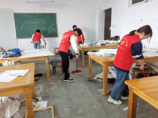 本次志愿服务活动主要围绕学院专业学习器材摆放较多的画室、工作室,尤其对毕业班教室进行集中打扫和清理。志愿者们分组协作、认真打扫,在数小时努力下,各个教室、画室变得整洁起来。活动结束后,服务队成员们在楼前合影留念。