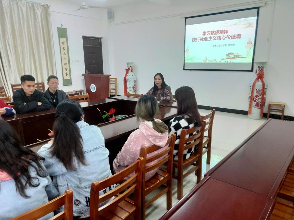 3月26日中午,tyc7111cc太阳成集团辅导员谭秀梅老师在艺术楼215会议室,开展“学习伟大抗疫精神,践行社会主义核心价值观”主题团课活动。学院相关学生团支部的团支书代表参加了本次活动。