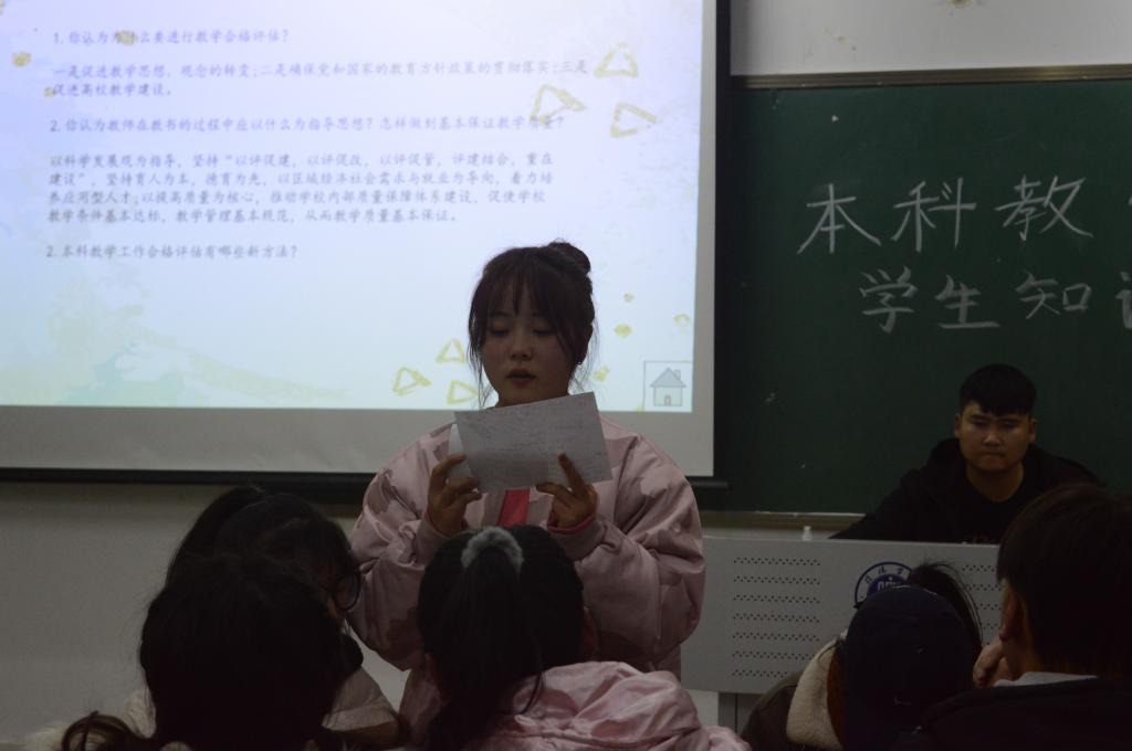最后,学工干事周扬对此次比赛做总结。他指出,本次比赛效果很好,参赛选手表现很出色。学生们在比赛中不仅得到了学习,增强了实践,在赛前中后不断地加深了对本科教学工作合格评估知识的学习巩固,也激发了同学们主动学习评估知识的积极性,为我院推进评建工作发挥出积极作用。希望同学们在今后的日子里一如既往地继续学习评估知识,并调动身边的所有同学加入到学习和参与本科教学工作合格评估的队伍中来,以校荣我荣、校衰我耻的高度的主人翁意识和责任感,为学校顺利完成评估工作贡献磅礴的青春力量。