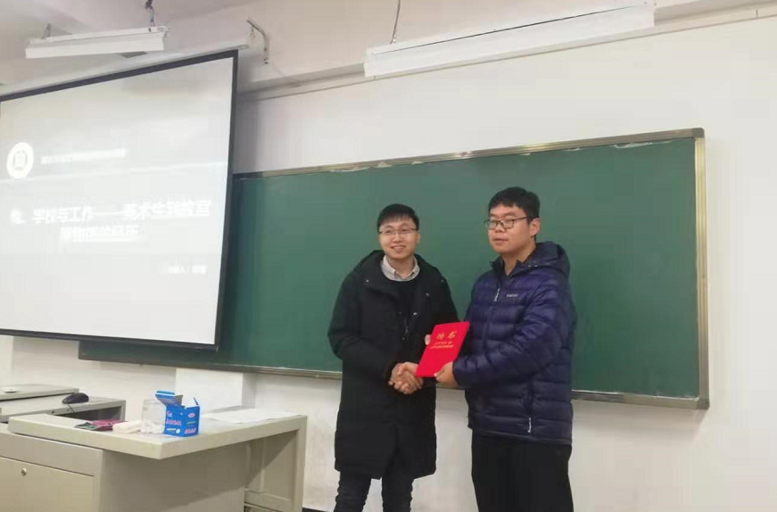 12月18日上午,我院优秀校友事迹报告会在艺术楼206教室举行。2009级美术学专业本科毕业生,现就职于故宫博物院的优秀校友胡博应邀为我院学生作了题为“我、学校与工作----美术生到故宫博物馆的成长经历”报告会。学院党总支副书记袁军、太阳集团处干事秦金峰,行政干事李海丽、团总支书记刘加宽、全体辅导员以及近100名同学参加了报告会。报告会由李海丽主持。