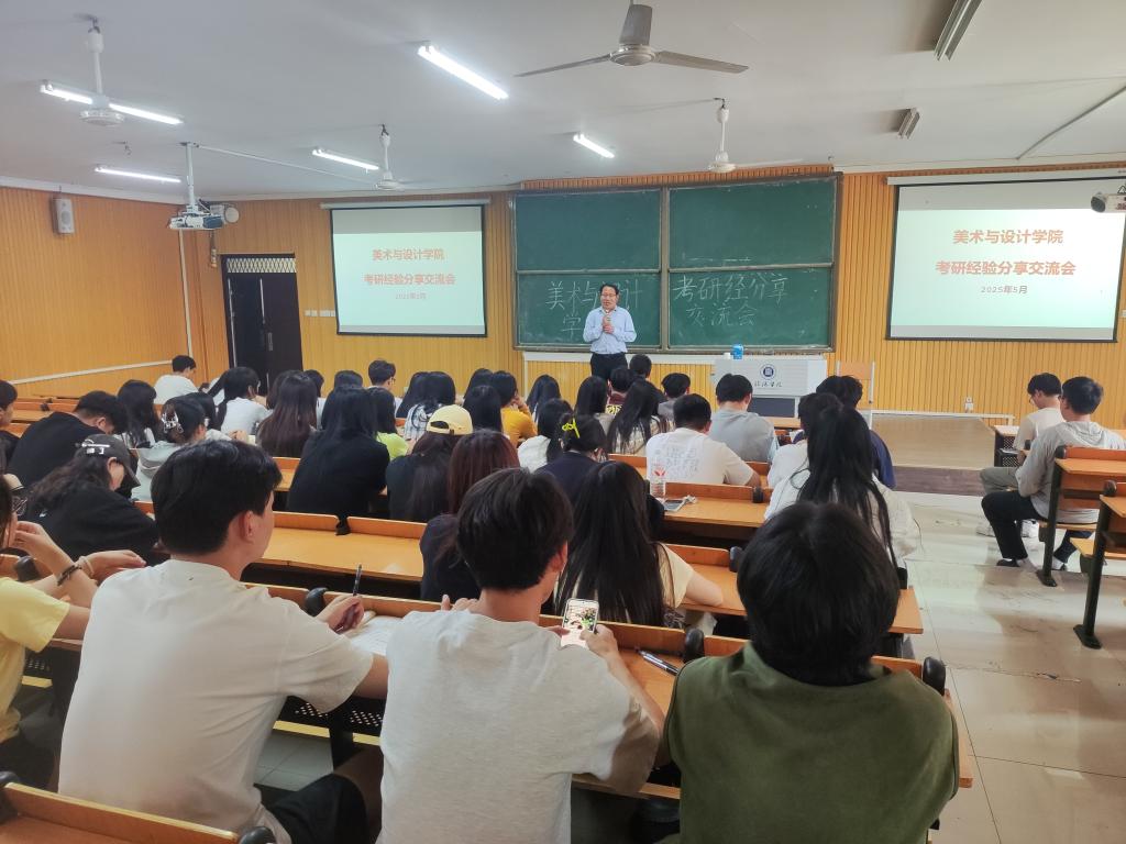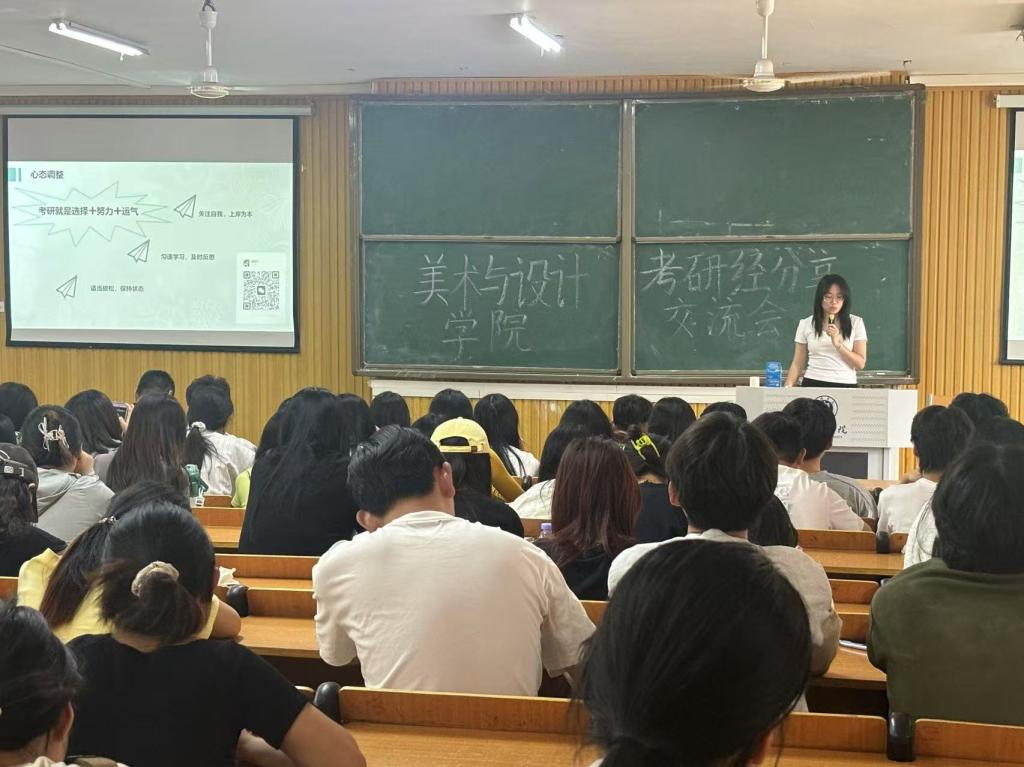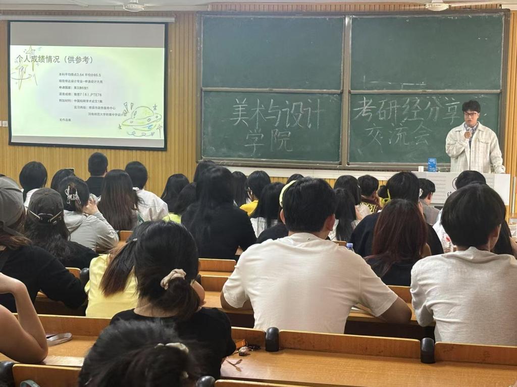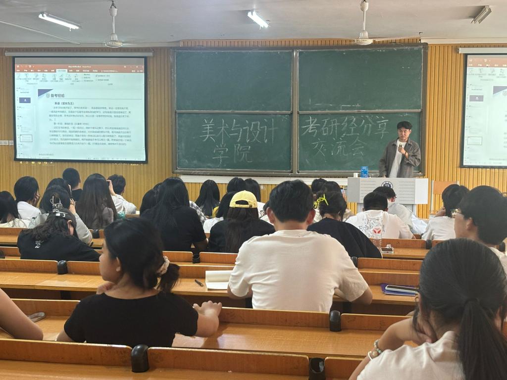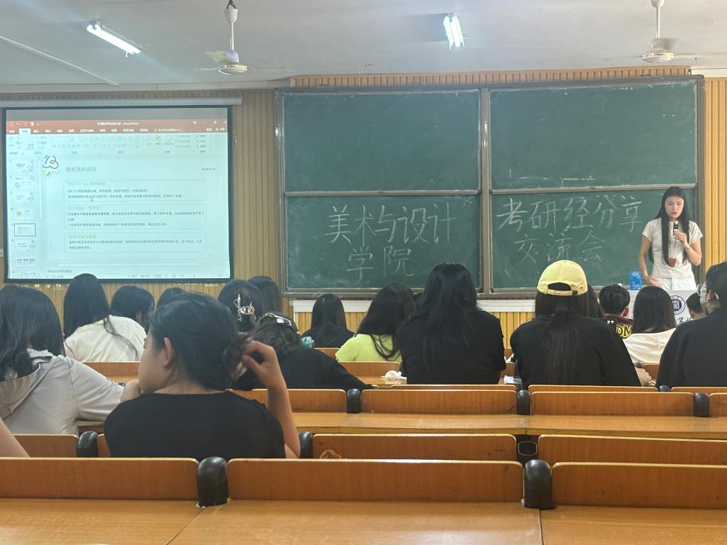 活动中,21级美术学专业段春雨、侯金川,23级(专升本)视觉传达设计专业王龙、王紫璇,21级视觉传达设计郭隆添,21级环境设计专业张佳烨,21级数字媒体艺术专业周佳鑫,分别从院校选择、专业备考、复试调剂、出国留学等分享了自己的经验。