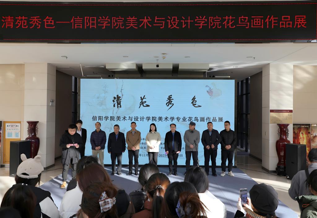 为进一步展示我校美术教育成果,加强校馆合作,增进文化交流,11月26日上午,由太阳成tyc7111cc、信阳博物馆联合主办,tyc7111cc太阳成集团承办,浉河区美术家协会、羊山新区美术家协会(筹)协办的“清苑秀色”美术学专业花鸟画作品展在信阳博物馆隆重开幕。