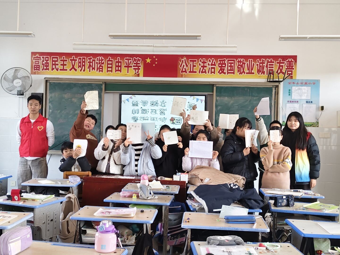 本次支教活动通过艺术教育引导小学生发现身边之爱,用画笔表达情感,在童真世界播撒美的种子。在“爱的色彩”绘画课堂上,志愿者指导孩子们用铅笔、水彩笔等工具,将抽象的情感转化为具象画面,创作出父母、老师关爱自己的场景,并在画作上写下对他们的祝福。