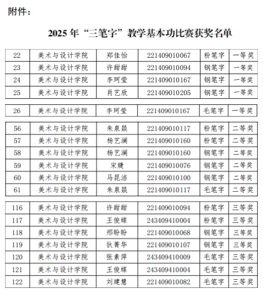 近期,学校举办的2025年“三笔字”教学基本功比赛圆满结束,我院美术学专业多名学生选手喜获佳绩,共荣获一等奖5项、二等奖6项、三等奖7项。